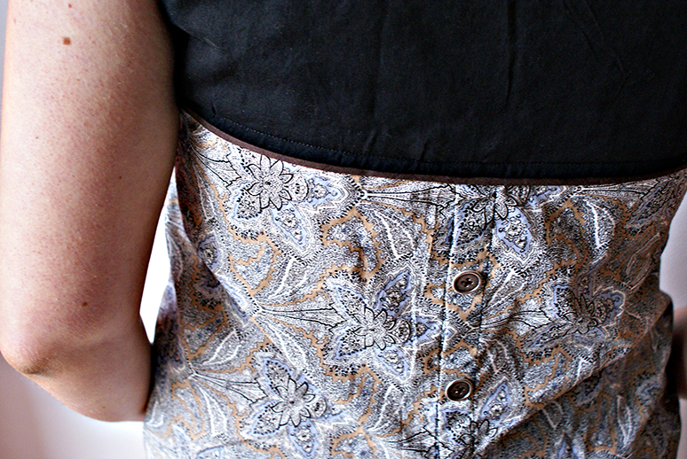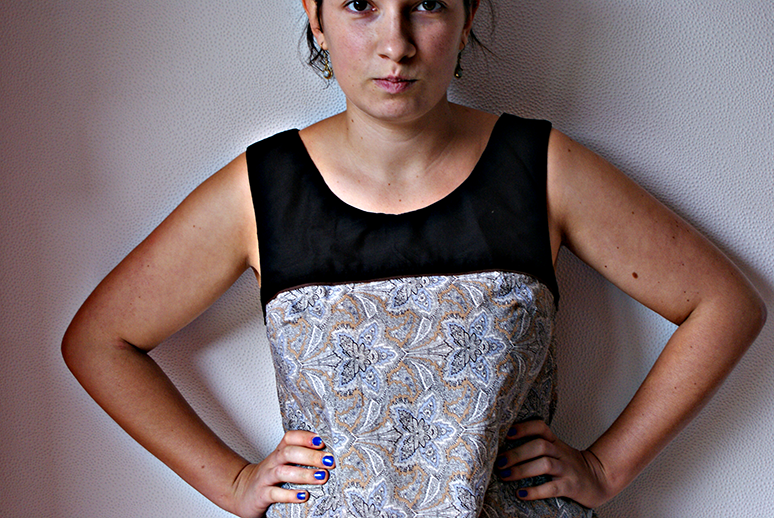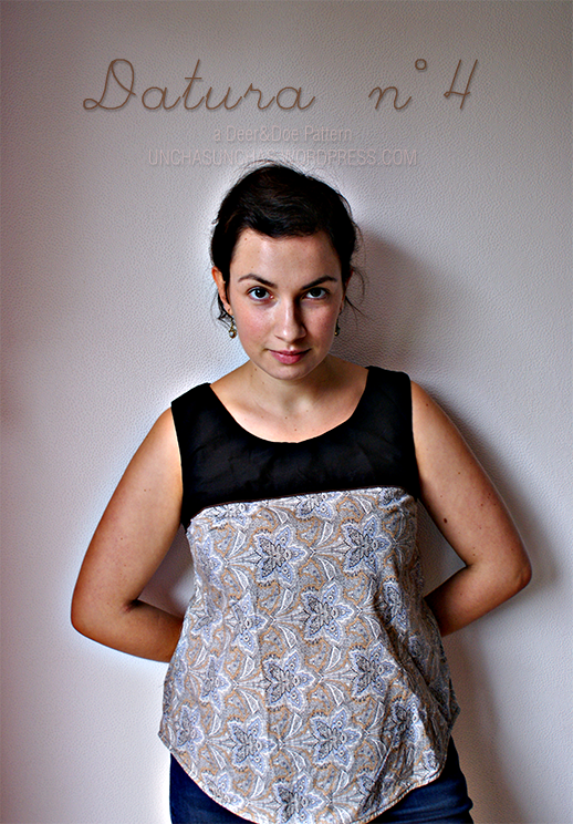 L’avant-dernière ! Comme vous pouvez le constater, beaucoup de variété sur ce blog ! Mais en même temps j’étais dans l’objectif recyclage et on ne peut pas faire grand-chose avec 30cm de tissu (hormis des Daturas, j’entends). Ici j’ai acheté un coupon de tissu style cashemere chez Papa Pique et Maman Coud (Breizh représente)(sisi) pour compléter (7€). J’adore le motif, j’avais déjà utilisé un coupon identique pour le haut d’une robe japonaise ! Le seul truc que je trouve bizarre c’est l’orientation du motif ! On dirait qu’il n’est pas dans le bon sens alors que c’est celui du droit fil (… perplexité).