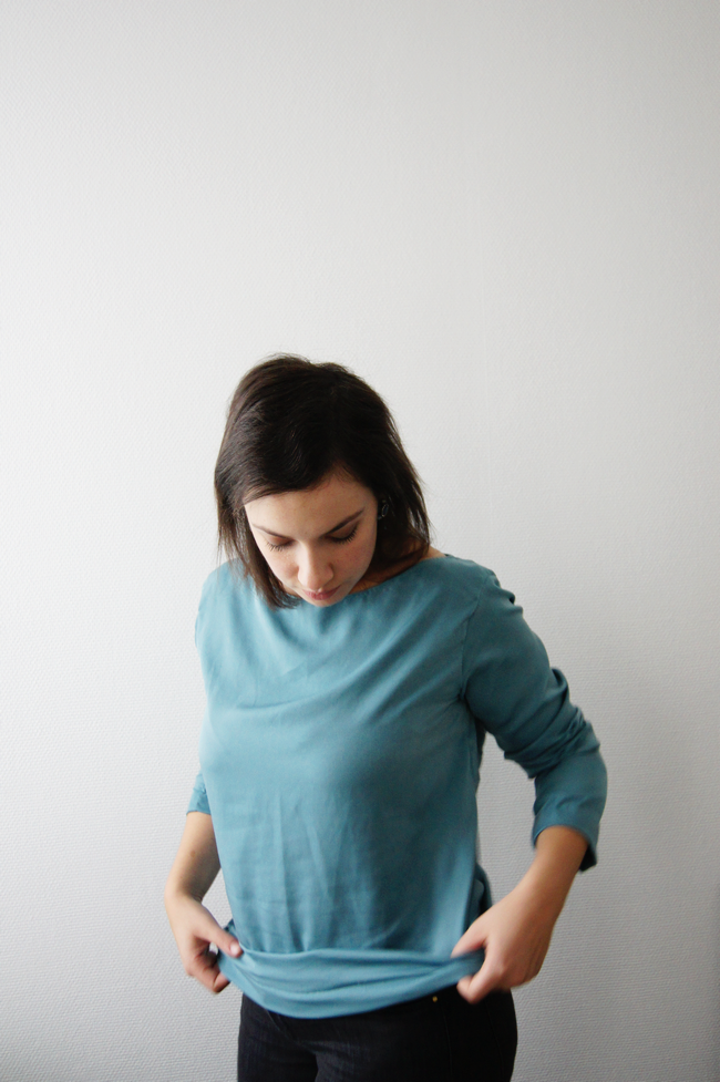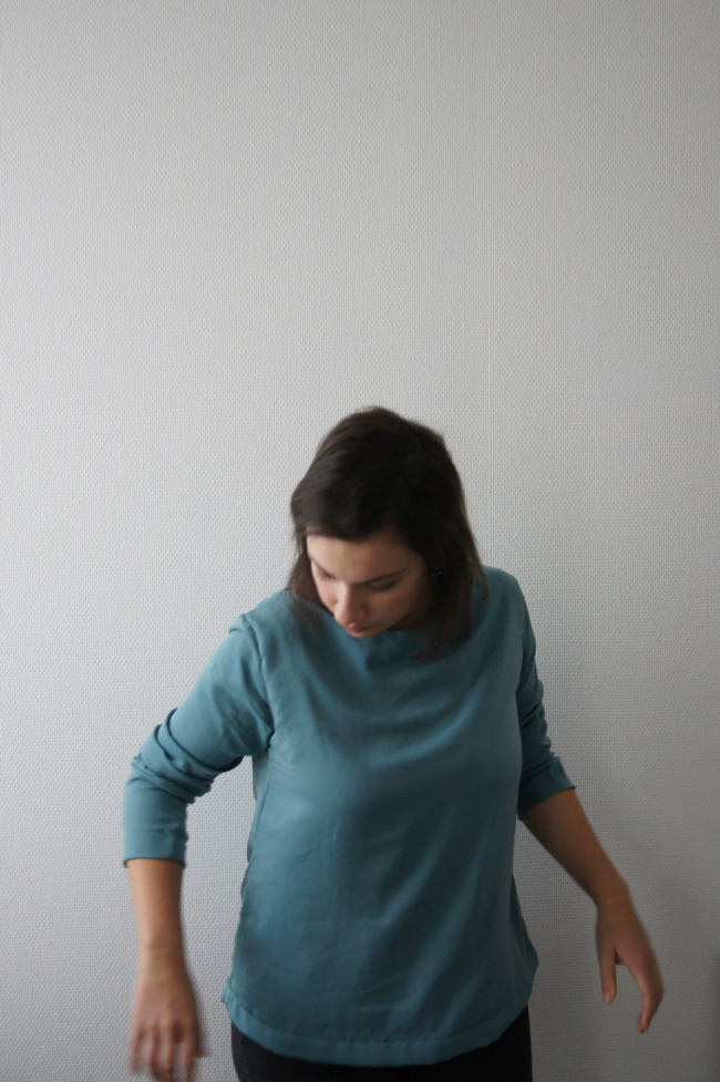 Les manches sont très longues (la preuve, je les remonte sur la moitié des photos) et le corps aussi ! Peut-être que plus tard je couperais les manches au ¾ si ce n’est vraiment pas pratique. Je trouve aussi le décolleté un peu trop … décolleté (ahah, surprenant !) au niveau des épaules … mais j’ai du rater un truc puisque c’est pas comme ça chez les autres. Peut être faire la taille inférieur au niveau épaules. J’aimerais refaire une version en tissu plus docile histoire de ne pas rester sur ce semi échec.