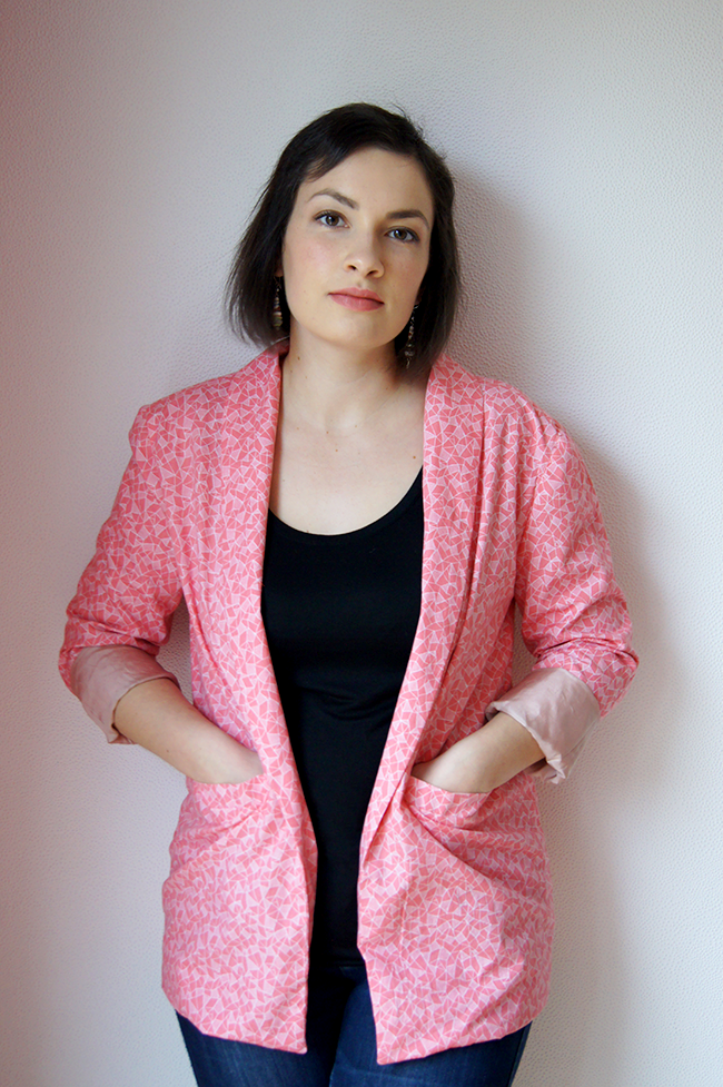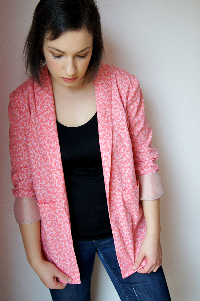 Sinon j’adore le tissu même s’il est difficile de lui rendre justice en photo 😦 Il n’est vraiment pas rose mais d’un joli (enfin je trouve) corail tirant sur le rose, et très lumineux. Il a un peu de tenue ce qui est plutôt bien pour une veste.