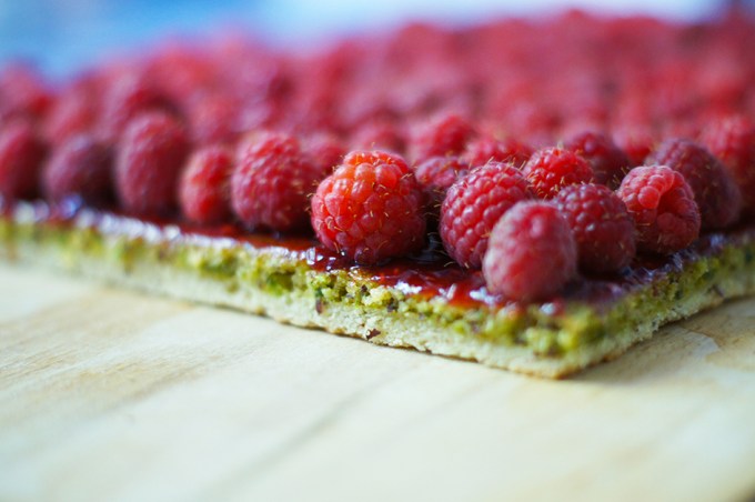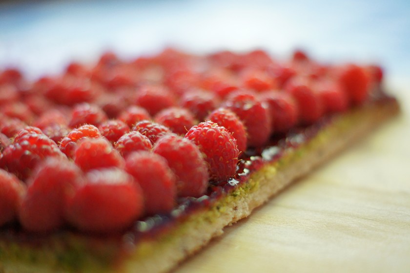 Le gâteau est composé des couches suivantes : Une pâte sucrée type pâte sablée, une crème d’amande à la pistache, de la confiture de framboise et des framboises.
