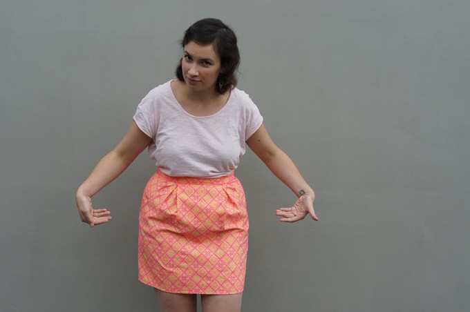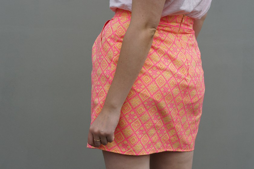Il me restait une mini chute du jacquard de ma Bernadette fluo-qui-pique et je me suis dit que c’était l’occasion de le liquider. J’ai rallongé la jupe (et c’est encore court …) et ajouté une ceinture pour me rapprocher du patron ACM. Je ne l’ai pas doublé mais ce n’est pas dérangeant pour une jupe d’été (pas de culotte foncée en revanche). Le montage s’est passé sans encombre, j’ai même ajouté du passepoil rose fluo (attention grosse fête !).