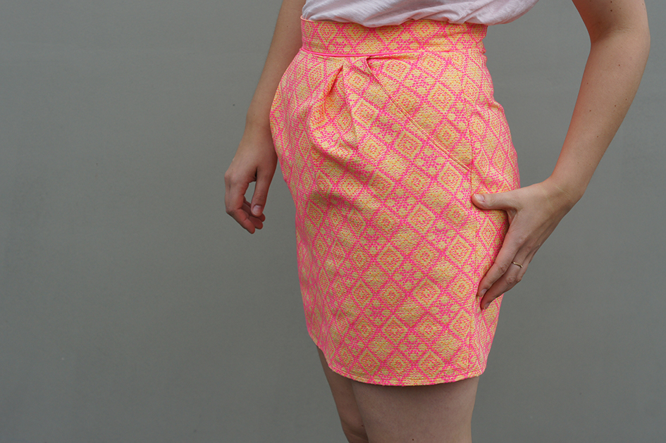 Il me restait une mini chute du jacquard de ma Bernadette fluo-qui-pique et je me suis dit que c’était l’occasion de le liquider. J’ai rallongé la jupe (et c’est encore court …) et ajouté une ceinture pour me rapprocher du patron ACM. Je ne l’ai pas doublé mais ce n’est pas dérangeant pour une jupe d’été (pas de culotte foncée en revanche). Le montage s’est passé sans encombre, j’ai même ajouté du passepoil rose fluo (attention grosse fête !).