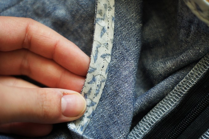 Dans la liste des modifications faites, j’ai aussi rajouté une bande de tissu de 5-6cm en bas pour rassurer ma maman qui trouvait que sinon c’était quand même un peu court. Et comme je ne voulais pas friser l’attentat à la pudeur, j’ai obtempéré … J’ai aussi remplacé la parmenture par du biais puisque j’en avais un joli dans les mêmes tons.