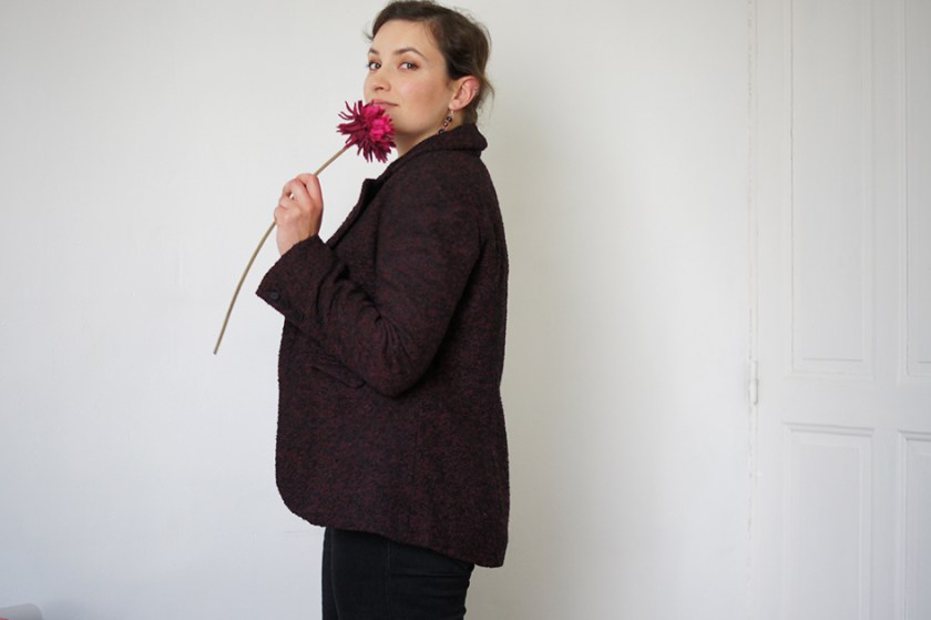 En terme de tissu j’ai pris un lainage qui est sans doute un peu trop épais pour cet emploi  : ça m’a permis de porter la veste au mois d’avril avec une écharpe sans problème mais je trouve le rendu trop grossier. En plus j’ai coupé du 40 mais un 38 aurait été plus joli au niveau des épaules. C’est ce que je ferais pour la prochaine puisque je porte ce genre de veste à 99.9% du temps ouverte.