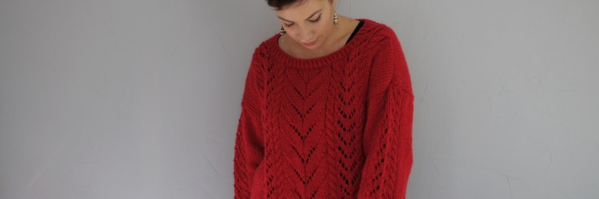 J’adore ! Et ce rouge te va super bien, mamamiaaaa !!! J’avais aussi repéré ce modèle chez Rachel dont je suis les podcasts tricot, mais la taille unique me faisait un peu peur … Au final, les motifs de dentelle/torsades sont trop beaux et je pense qu’il y a moyen de réduire l’ampleur en ôtant quelques mailles sur les côtés … Quoique avec ce froid, je ne serais pas contre un bon gros pull doudou non plus ! Bref … tout ça pour dire que je retourne de ce pas télécharger le patron chez Rachel ! 🙂