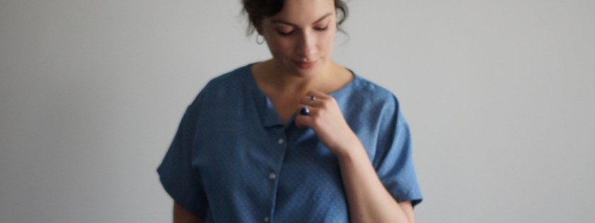 Sinon Girouette c’est un haut à col rond, boutonnage dans le dos ou devant, emmanchures tombantes et manches courtes ou longues au choix. Les tissus fluides sont les bienvenues, ma 1ère version a été cousue en XX et la seconde en viscose. Petits coupons bienvenus également avec moins de 1m50 pour la version manches courtes.