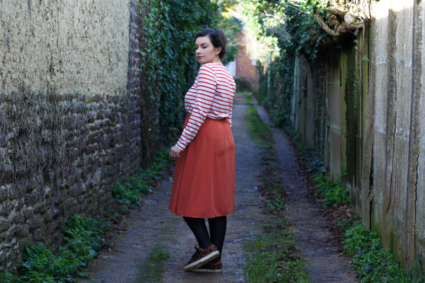 Ensuite, j’ai du mal à assortir les jupes car je suis toujours tentée de les porter avec des pulls amples et ça crée trop de volume. Avec des tee-shirts ce n’est pas évident non plus, il faut les rentrer dans la jupe et on en revient au point que ça fait un effet « gros ventre ».