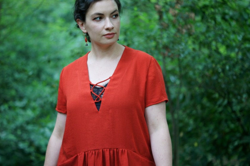 Je pense la refaire mais sans le lien, peut-être avec des oeillets pour pouvoir ajouter le lien si je change d’avis. Ou alors à voir si je modifie l’encolure pour avoir un V décent que je peux porter sans rien. En tout cas merci encore pour la découverte de ce patron, en plus je peux enfin avoir une robe à poches (je ne couds jamais les poches côté qui ajoutent malheureusement du volume sur les hanches). Bonne journée!