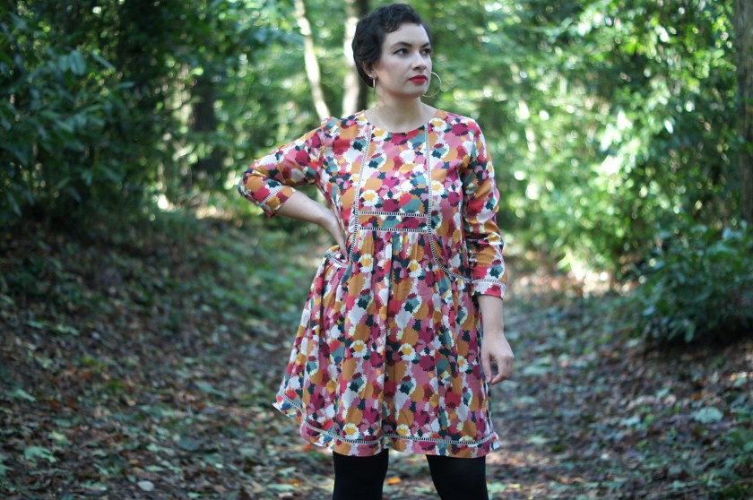 Avant de coudre, j’avais remarqué qu’un commentaire qui revenait souvent, c’était celui de la longueur. Personnellement je n’ai pas touché (je fais 1,67m) mais il ne faudrait pas plus court. Pour l’automne/hiver avec un collant ça ira bien.